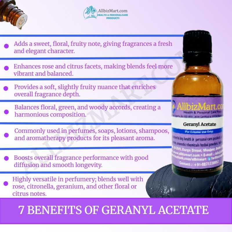 Geranyl Acetate has a sweet, floral, and fruity aroma with fresh rose and pear-like notes, perfect for elegant compositions.